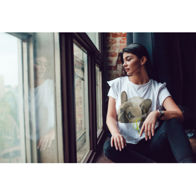 Koszulka biała z nadrukiem leżącego Buldoga Francuskiego o wymiarach grafiki szer. 30cm, wysokość 21cm oraz napis z imieniem psa.